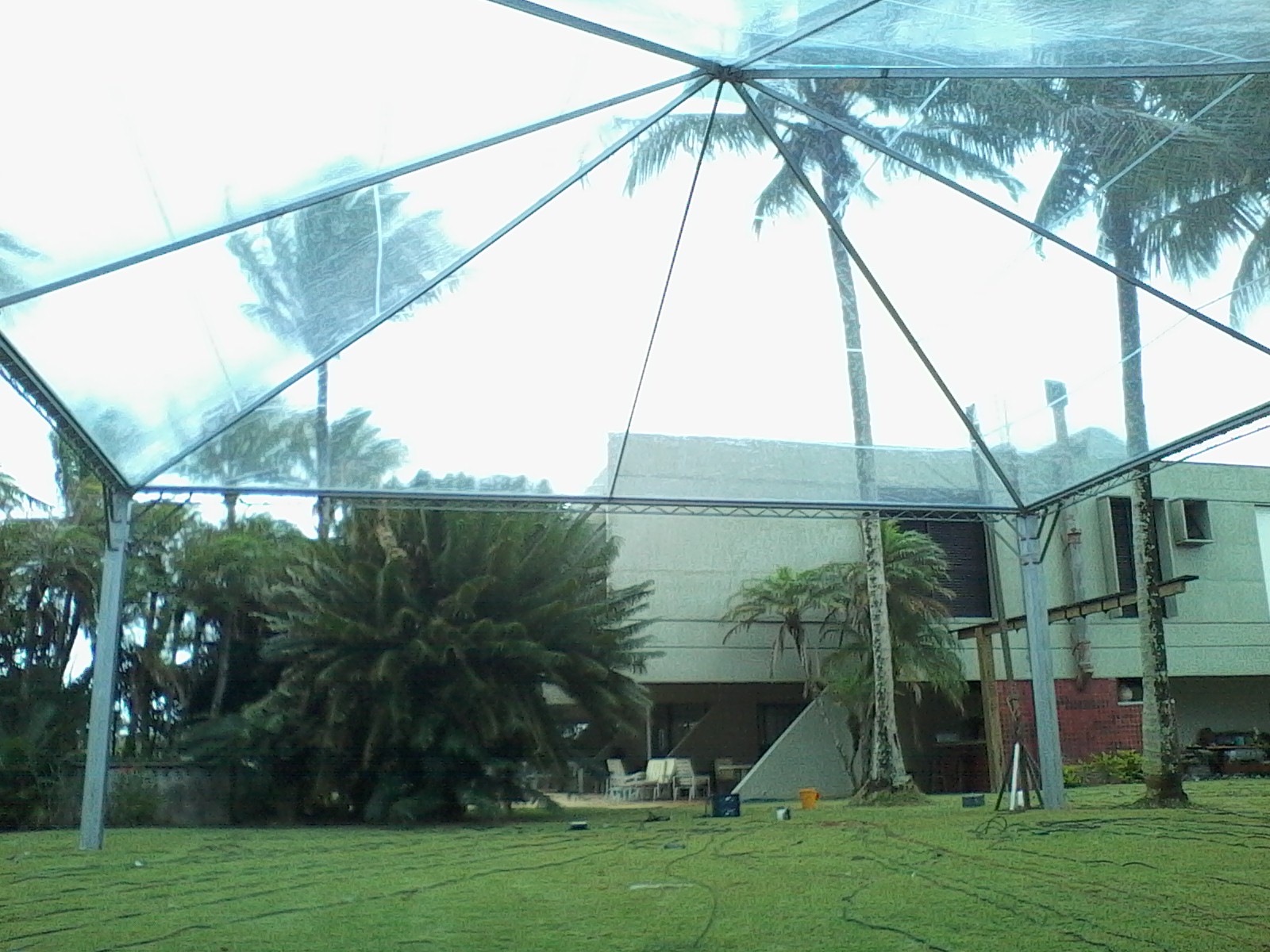 Tenda Cristal montada em um gramado de uma mansão em Caraguatatuba-SP, tenda com dimensões de 10m x 10m com lona transparente, calha lateral e fechamento em lona cristal, dando um charme a mais em seu casamento.